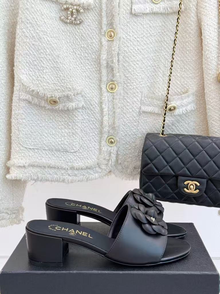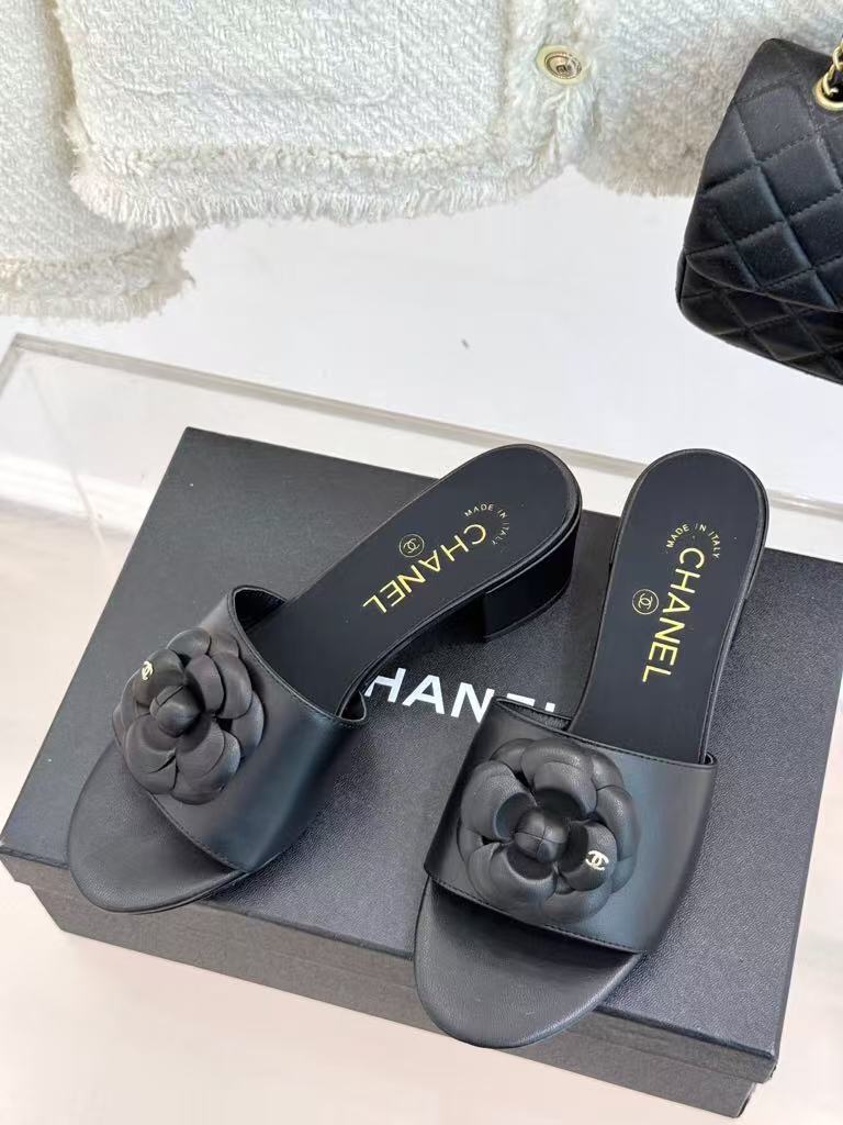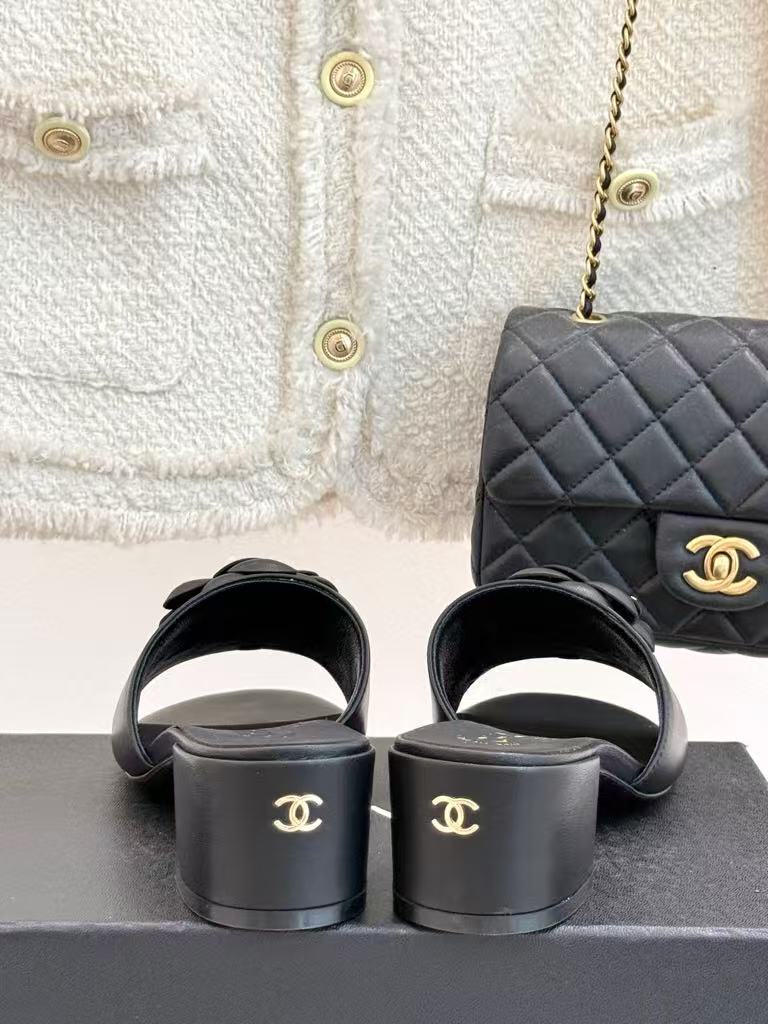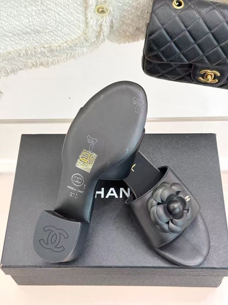 Chanel’s new ladies’ fashionable and versatile exquisite and elegant genuine leather lining comfortable camellia thick heel slippers