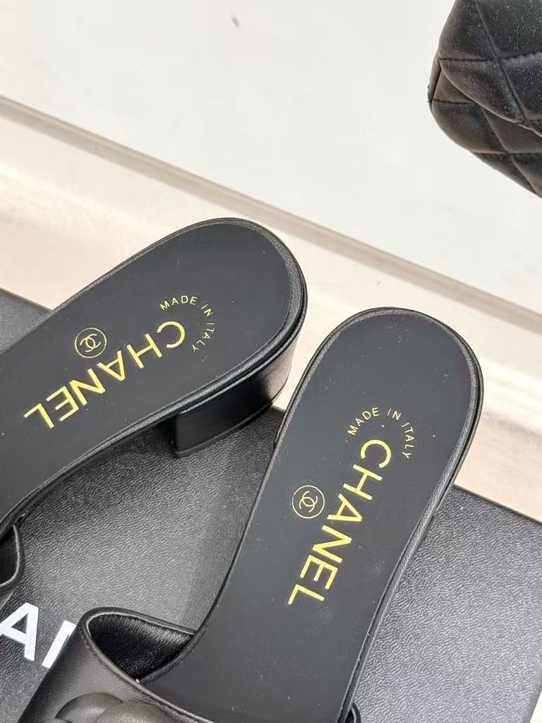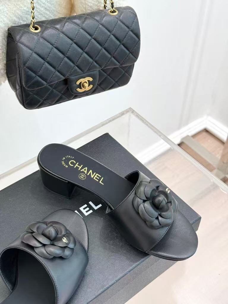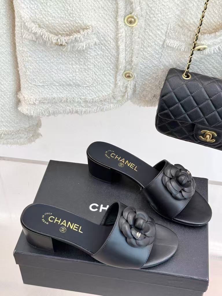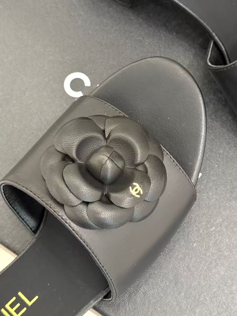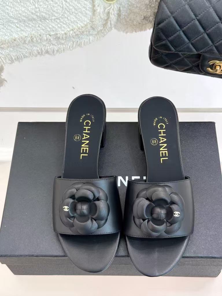 Chanel’s new ladies’ fashionable and versatile exquisite and elegant genuine leather lining comfortable camellia thick heel slippers