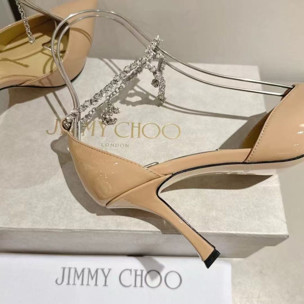 Jimmy Choo new women’s fashion kitten heel with hanging buckle fork triangle rhinestone strap genuine leather sandals