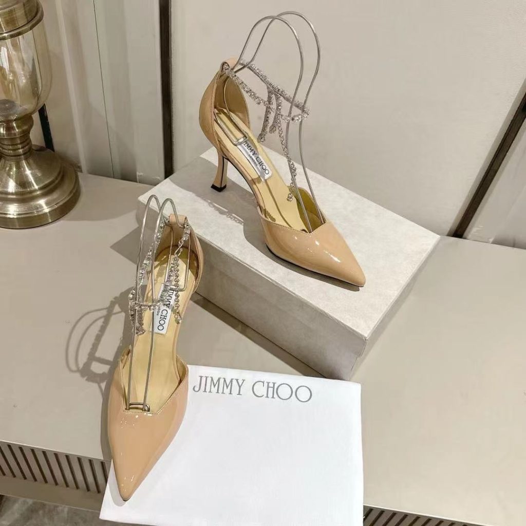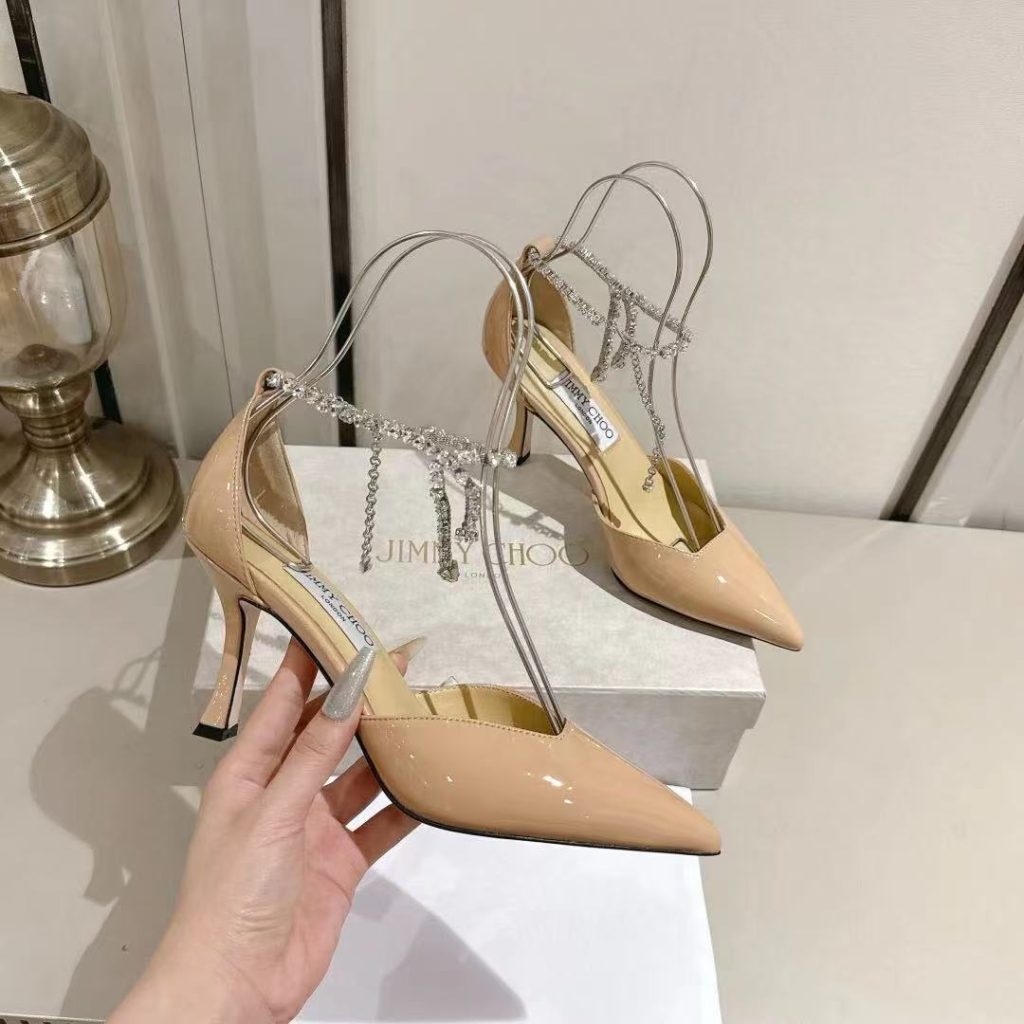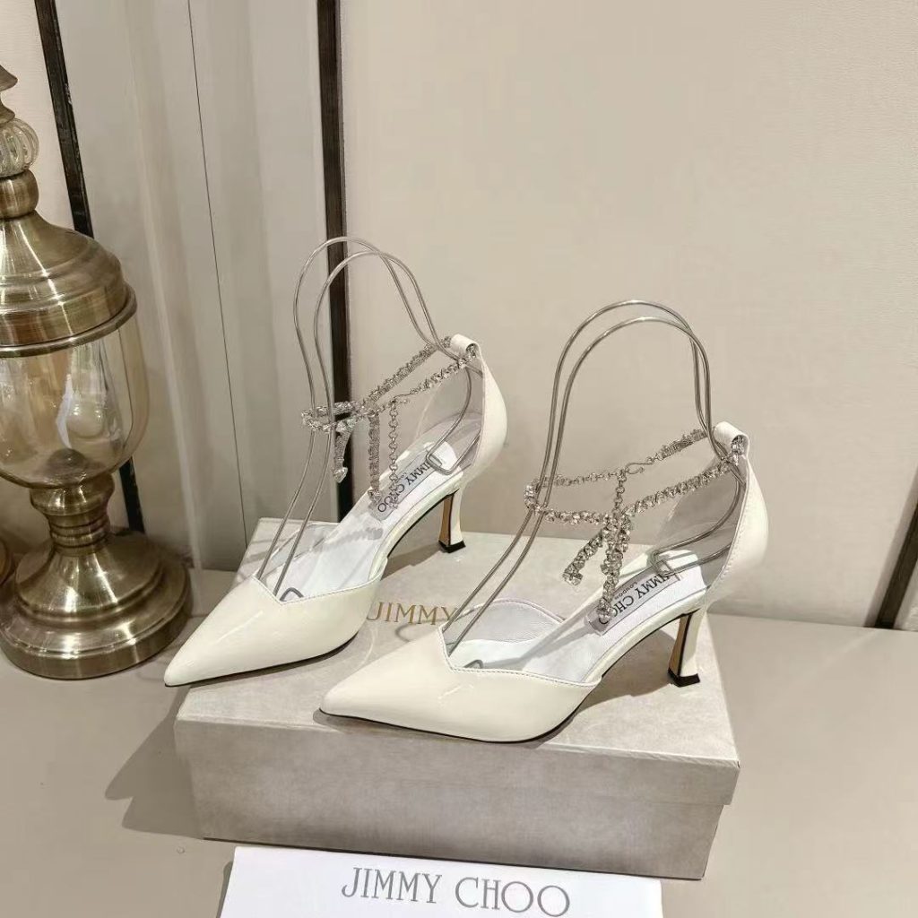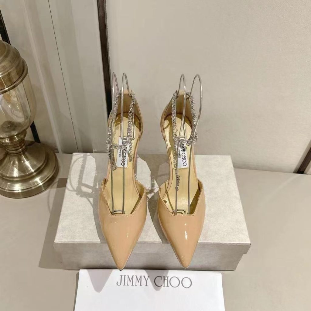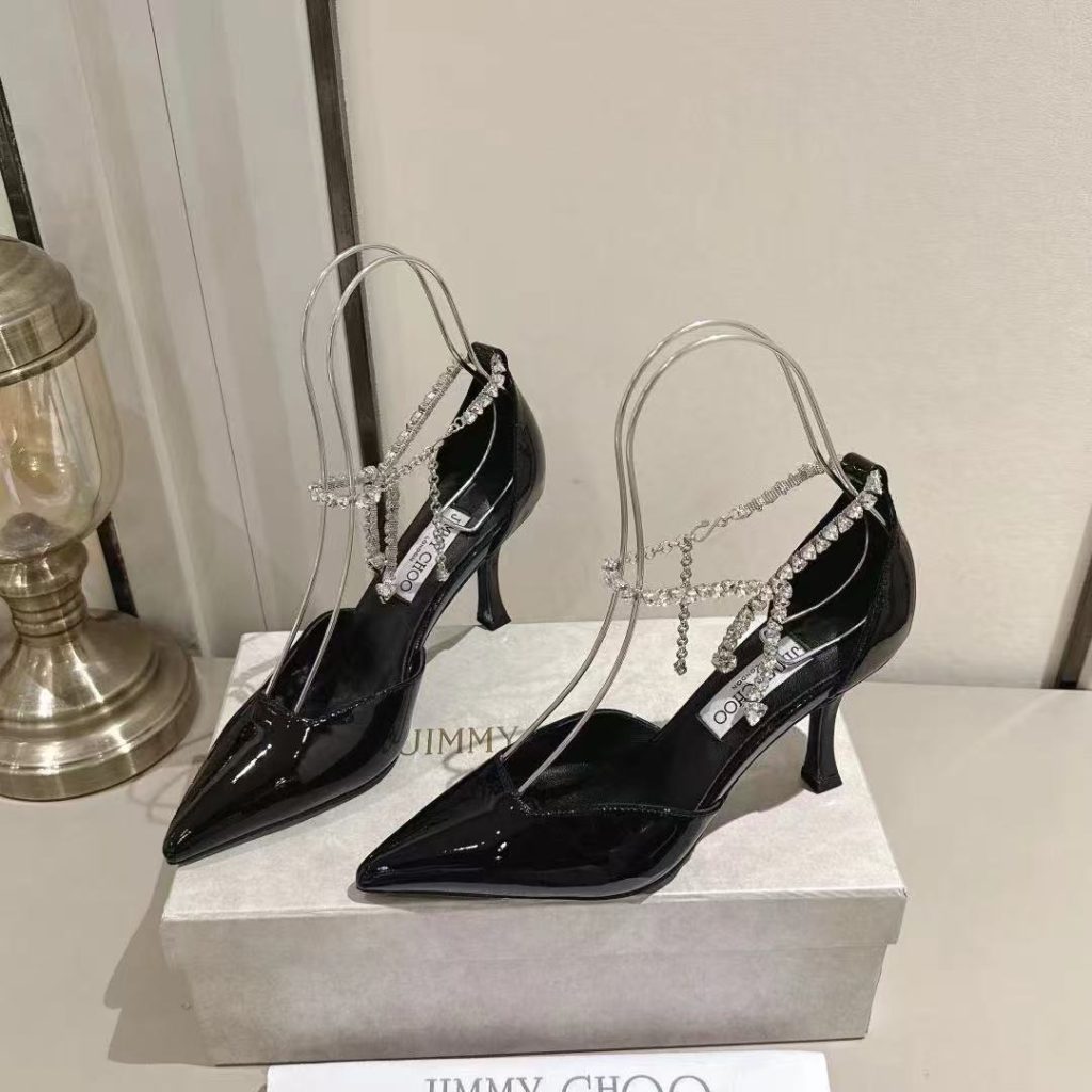 Jimmy Choo new women’s fashion kitten heel with hanging buckle fork triangle rhinestone strap genuine leather sandals