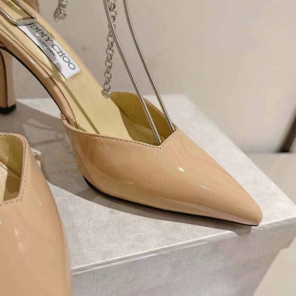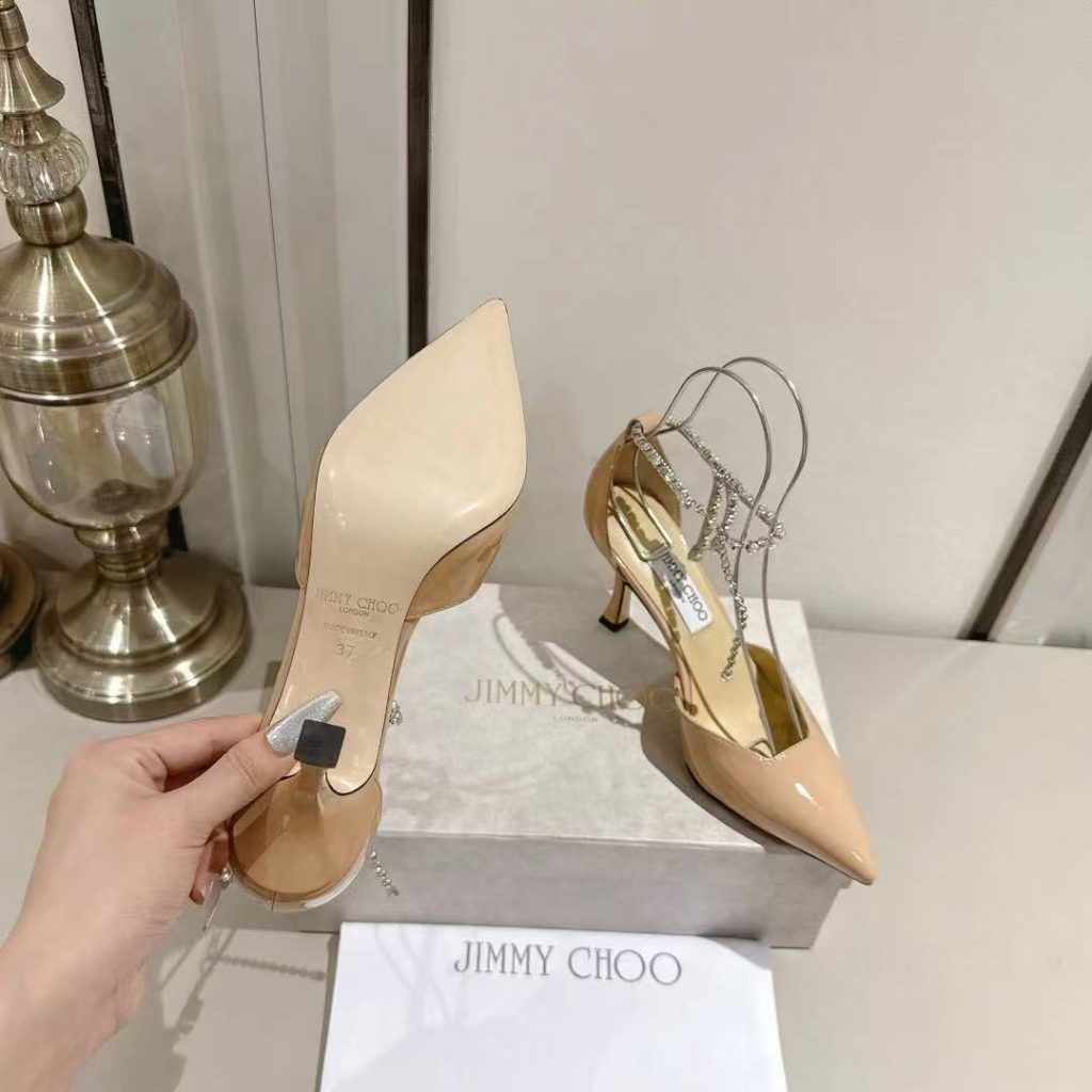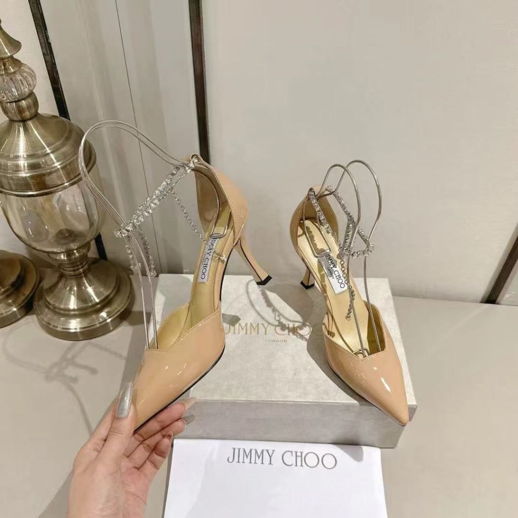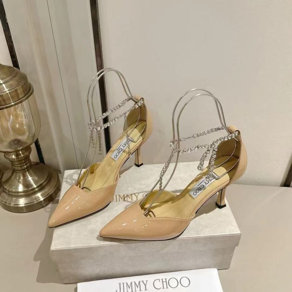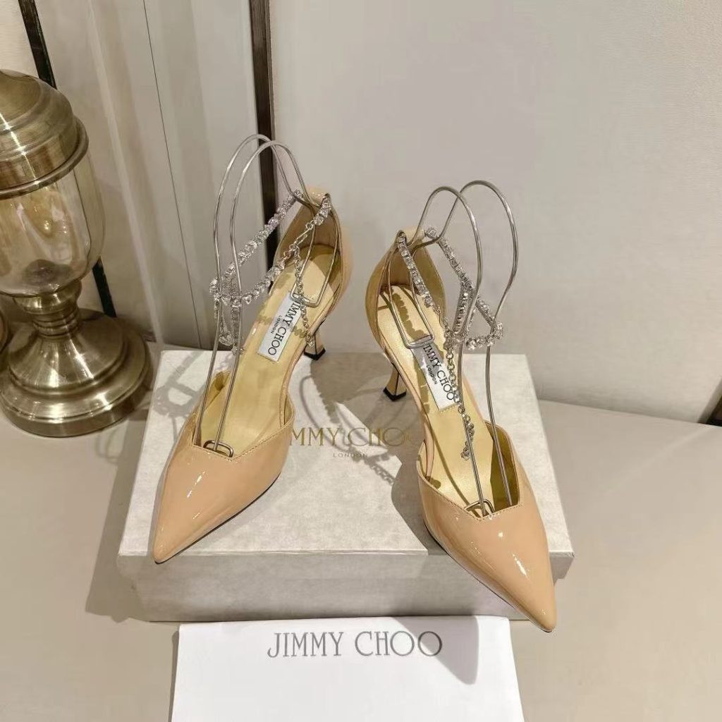 Jimmy Choo new women’s fashion kitten heel with hanging buckle fork triangle rhinestone strap genuine leather sandals