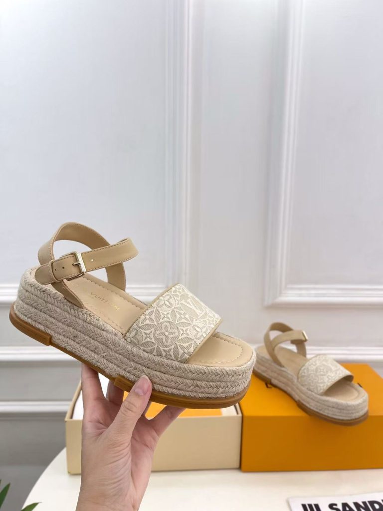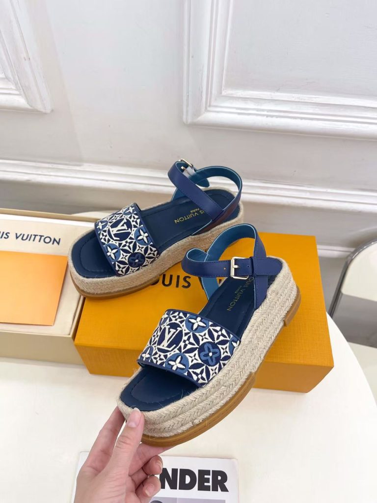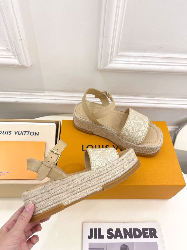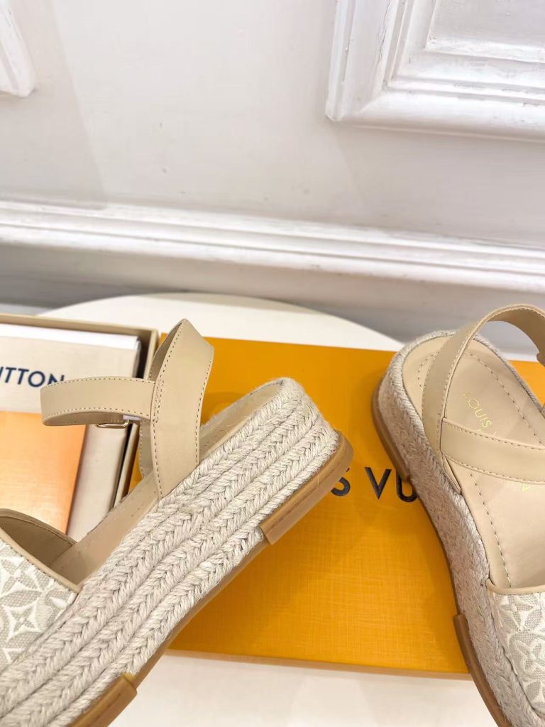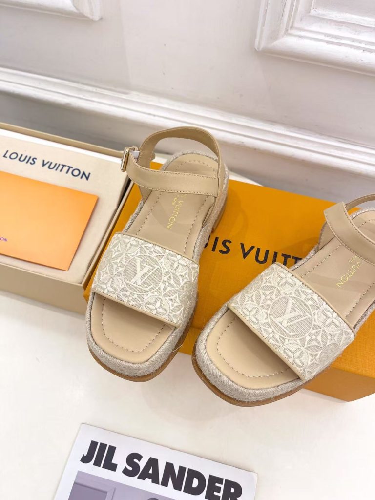 Louis Vuitton’s new fashion canvas embroidery hemp rope thick-soled versatile sandals